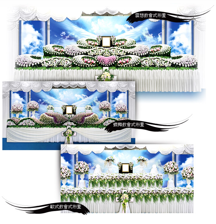 禮廳外牌1組告別式場外牌懸掛(主內x弟兄姊妹追思彌撒奠禮會場)6000三樣花1式告別式禮堂專用瓶花,獻花,相片框花(精緻插花)1500式場佈置24尺西式精緻花藝精心設計鮮花式場(3種花壇擇一)50000羅馬花柱1對精緻藝術花藝(加大)3000花架1支十字鮮花架2000禮廳布幔1式式場禮廳內懸掛佈置(全包式)10000禮廳地毯1條鮮花式場前迎賓地毯(大T字型)5000遺像1組15吋相片(含藝術框) 30吋放大生活照(式場佈置)2500禮品1組來賓十字胸花黃絲帶,簽名簿,禮簿,謝簿,簽字筆,香燭1000